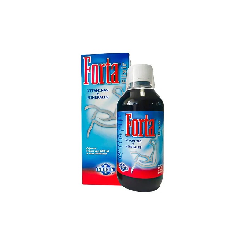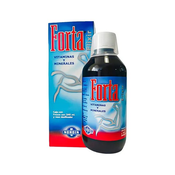 Forta Elixir 240 mL de Nordin es un suplemento vitamínico y mineral formulado para apoyar la recuperación en casos de anemia, debilidad o fatiga. Su fórmula rica en vitaminas del complejo B, ácido fólico, hierro, zinc y más, lo convierte en un excelente apoyo hematopoyético.