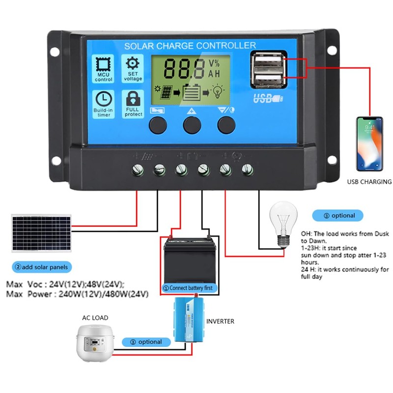 • Widely Used: Outdoor solar controller with two USB ports is compatible with 12V/24V systems; the 5V/2A USB port supports charging cell phones or other 5-voltage devices, which can protect the lithium battery from overcharging and discharging, suitable for home, industry, business, etc.