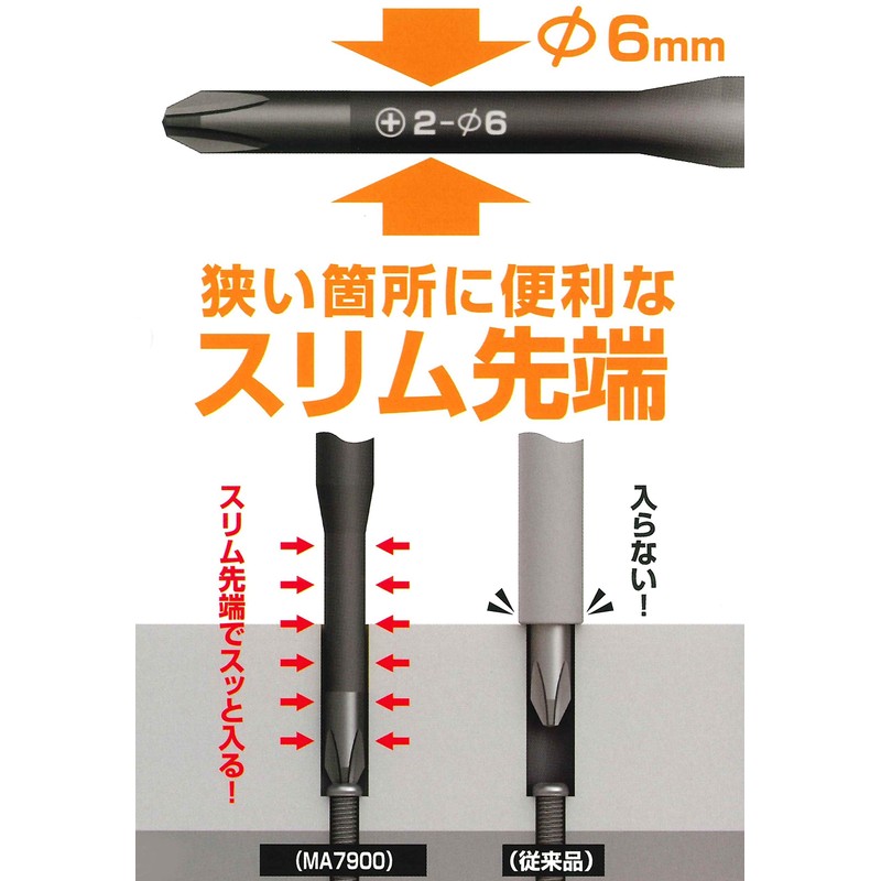 - 1000V tolerant voltage tested. Slim tip (Φ0.24 inch (6 mm) with magnet) convenient for narrow places. For work with electrical and communication facilities, etc