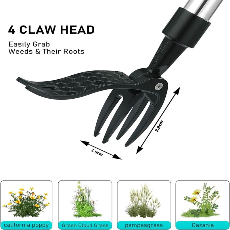 • 【Weeding Tool with 4 Claws】This steel weeder is designed with 4 jaws, all you need to do is keep standing, push the jaws into the center of the weed, step down on the foot pedal, let the sharp teeth grab the roots, tilt to the side and pull out the weed.