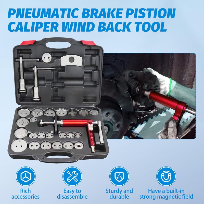 Angchun Pneumatic Brake Caliper Compression Tool, 28-Piece Heavy Duty Disc Brake Caliper Piston Compressor Rewind Tool Set Wind Back Tool Kit with 23 Adapters for Brake Pad Replacement Reset