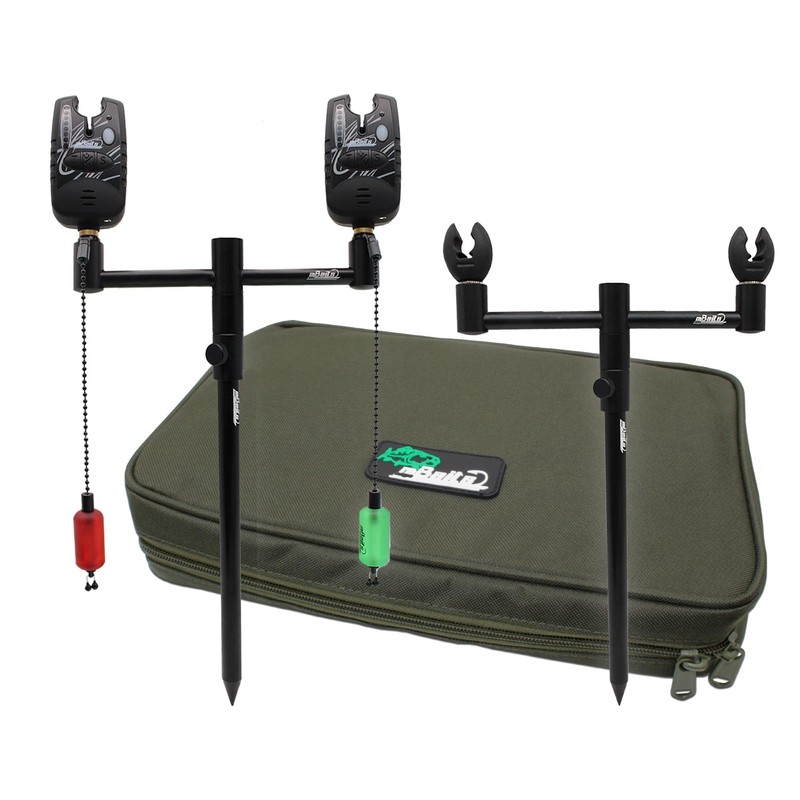 - Complete set: the set contains two buzzer bars, two bank sticks and two rod rests, two bite alarms with bobbins and a bag.