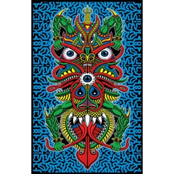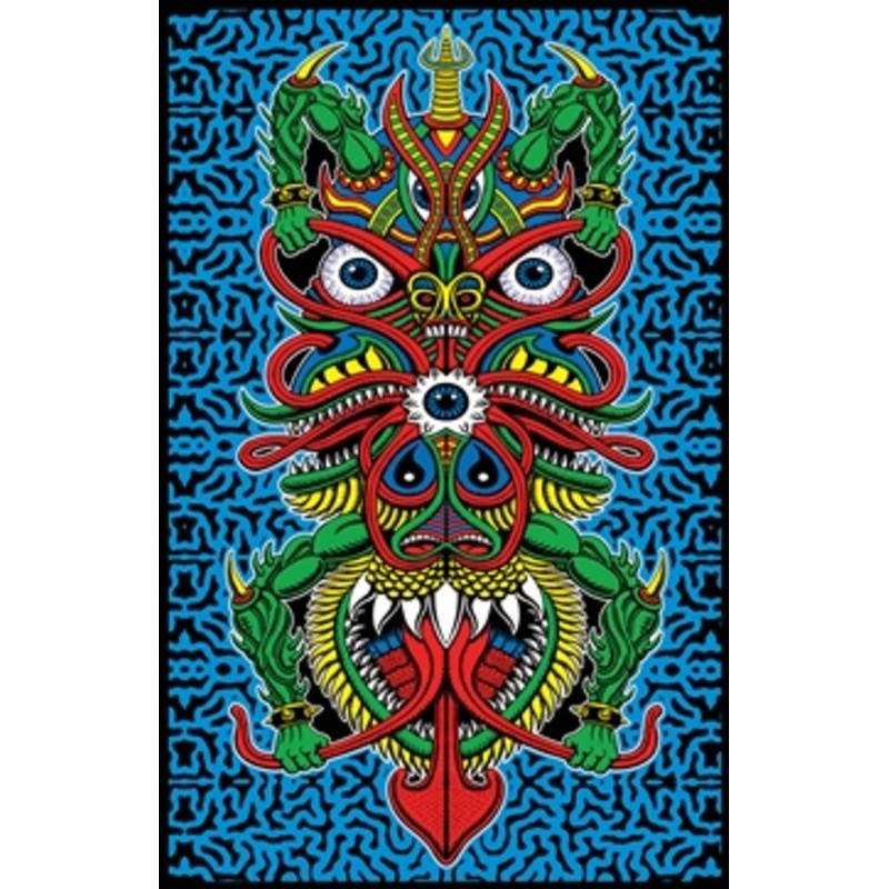 **Angel of Death by Chris Dyer Blacklight Poster** , 23 inches x 35 inches, standard sized. This poster artwork by Chris Dyer features what he calls an Angel of Death. The monster has arms pulling on his forked tongue and another set pulling on his eye sockets. There are so many details to this monster, it will keep you looking at it, but hopefully won't cause nightmares. The artists use of color highlights and alternating between lighter and dark colors makes for a truly thought out blacklight image that has one of the best blacklight reactions you will ever see. Printed in the USA with highly fluorescent inks and black flocking. Blacklight posters make great decoration for bedrooms, college dorm rooms, parties, entertainment rooms, or wherever you need a splash of color or glow. A flocked poster has black fibers that feel felt-like. The black appears much darker than an ink with no glare and gives great contrast to the fluorescent UV reactive inks. The poster has a 3/4 inch (1.9 cm white border around the whole poster, which is normal for screen printed blacklight posters. The posters get pulled through the printing press by this border and the area cannot be printed. Blacklight not included and is required to see the poster fluoresce or glow in the dark. Image under blacklight is for reference only, results may vary depending on type of blacklight (ultraviolet fixture or bulb) used.
