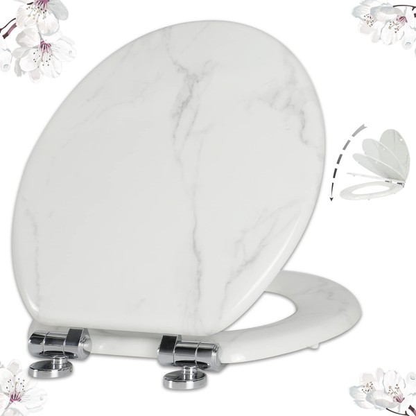 Angel Shield Marble Toilet Seat Durable Molded Wood with Quiet Close,Easy Clean,Quick-Release Hinges (Round,White Marble)