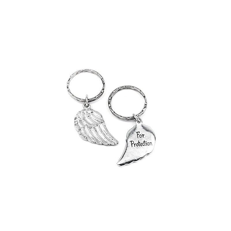 Angel Wing metal Keyring For Protection message. Handmade pewter keyring, double sided keyring with a detailed feathered effect angel wing on one side and 'For Protection' inscribed on the reverse. Sturdy keyring, handmade in the UK. Packaged in an organ
