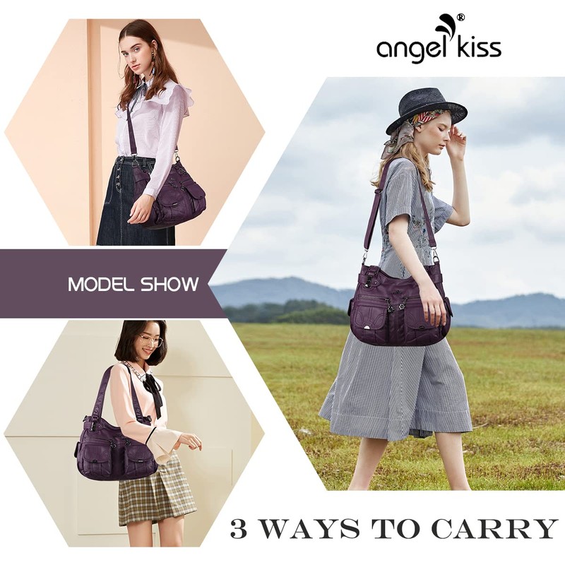 Angelkiss Women's Designer Handbag Large Double Zipper Multi Pocket Washed, Purple