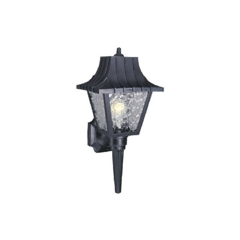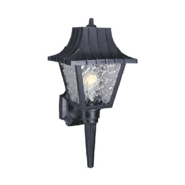 Single light wall lantern, with removable tail, high impact black finish polycarbonate, clear textured acrylic panels, width 8", length 8", height 17-1/2", extends 8-1/2", uses clear standard base bulb, A-19, torpedo, 60W maximum. Manufactured in china.
