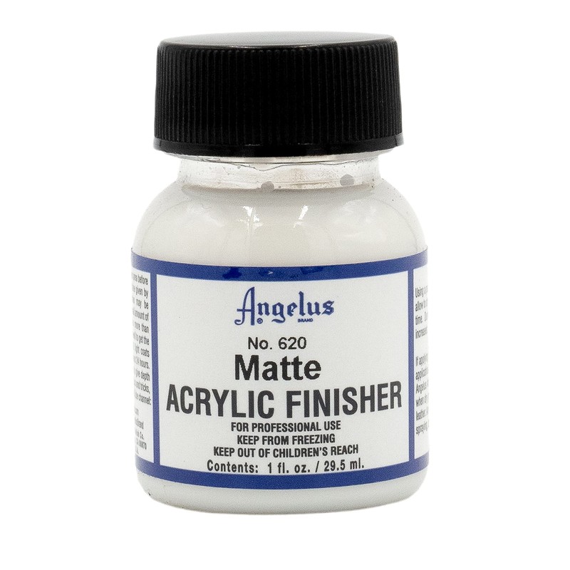 Angelus Acrylic Finisher Matte Number 620 gives a matte look to finished leather products. Gives a uniform look to painted products while protecting from minor scratches and scrapes. Flexible sealer will not crack, peel, streak, or rub off. Can be used on shoes, belts, handbags, saddlery, tack, and upholstery. Easy to apply with a sponge, rag, wool, spray-gun or brush. No buffing required. Water-based and cleans up with soap and water. 1 oz bottle
