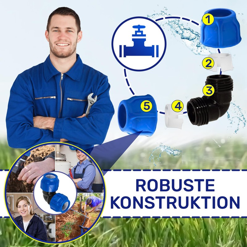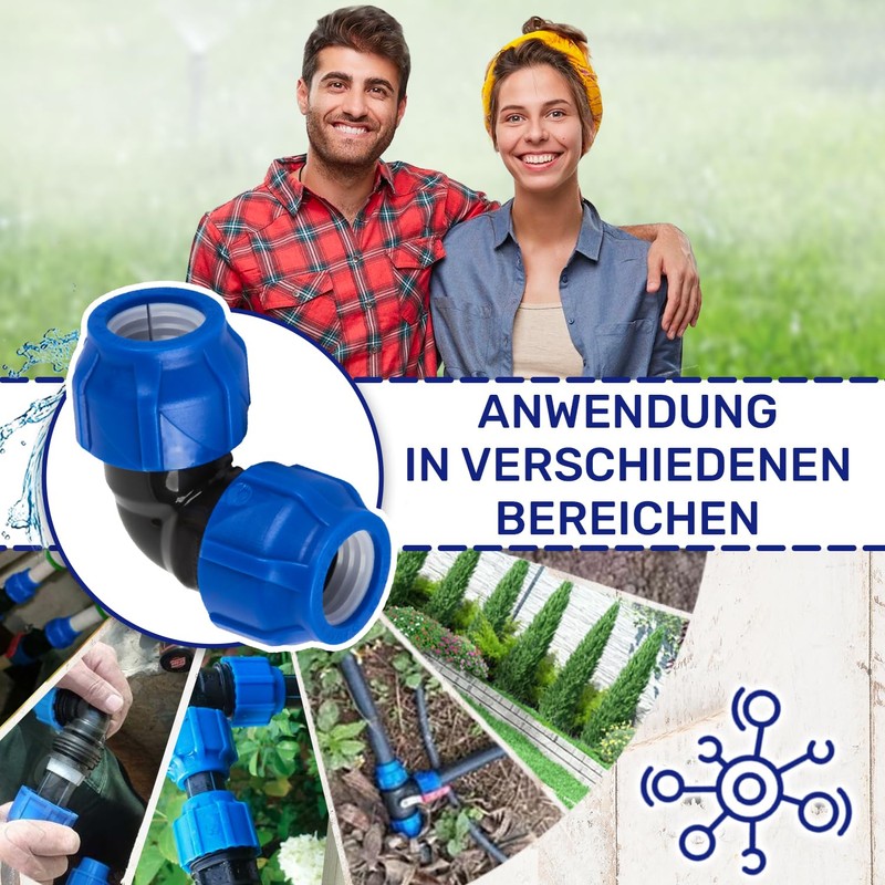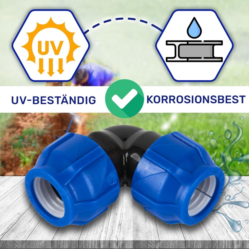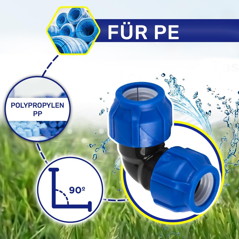 - Suitability: This angle connector is designed for seamless integration into PE pipes, including PE-LD, PE-HD and black polyethylene, which is often used in agriculture