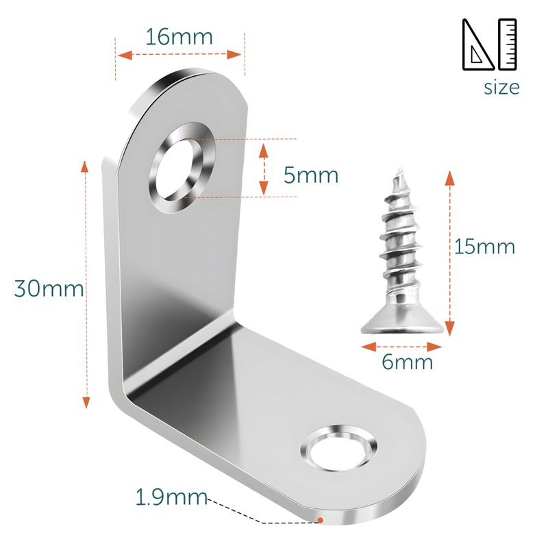 - Box contents: 10 pieces L-shaped angle connectors made of stainless steel (25 x 25 mm) and 20 pieces matching screws for mounting