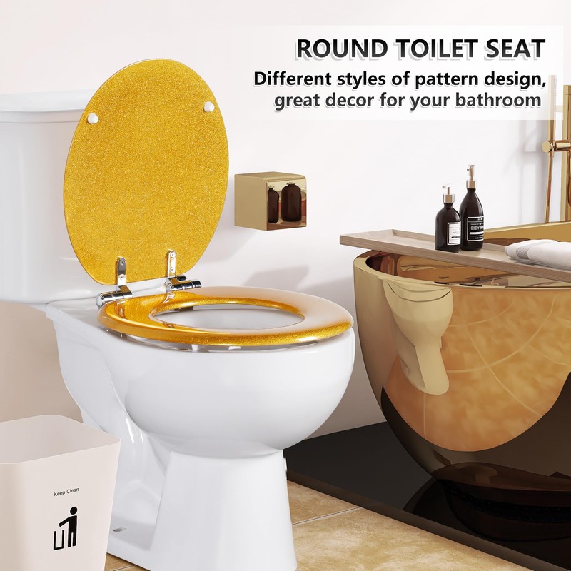 Angol Shiold Glitter Toilet Seat Molded Wood Round Toilet Seat with Quietly Close and Quick Release Hinges, Easy to Install also Easy to Clean (Round 16.5'', Gold)