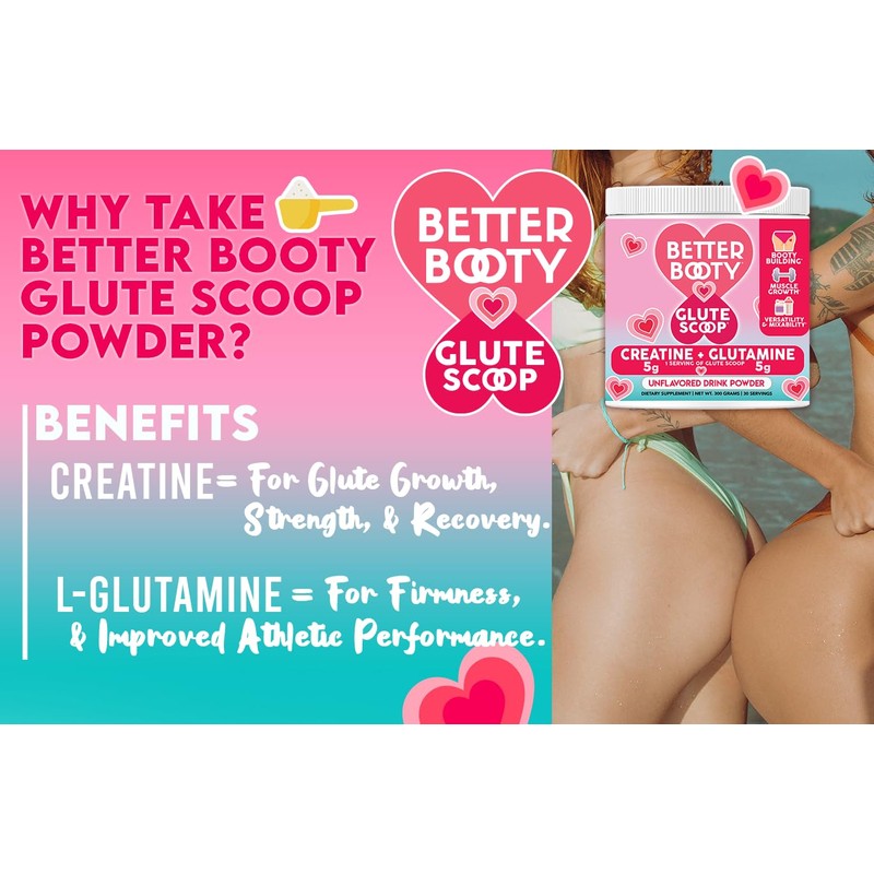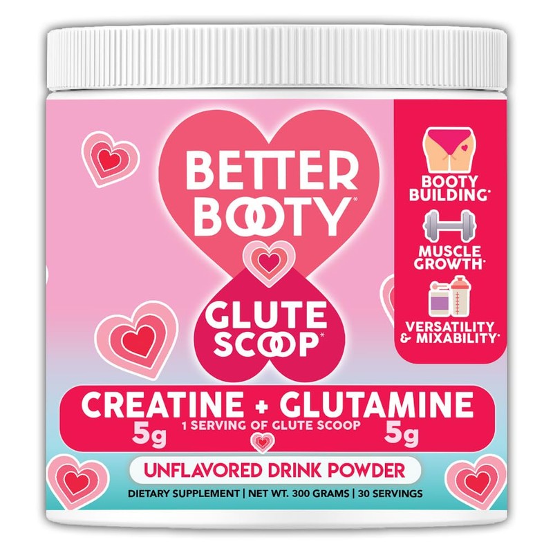- OWERFUL 2IN1 GLUTE GROWTH FORMULA- SUGAR FREE: Better Booty Glute Scoop is an unflavored powdered drink supplement specially crafted for women aiming to enhance and tone their glutes with the power of Creatine and Glutamine. Why purchase Glutamine and Creatine in separate supplements, wasting both your time and money, when you can combine the powers of both in one convenient product! Our premium performance powder contains 150g of 100% Creatine Monohydrate 200 Mesh and 150g Glutamine in each container! Glute Scoop is unflavored, high quality, and easy to use!
