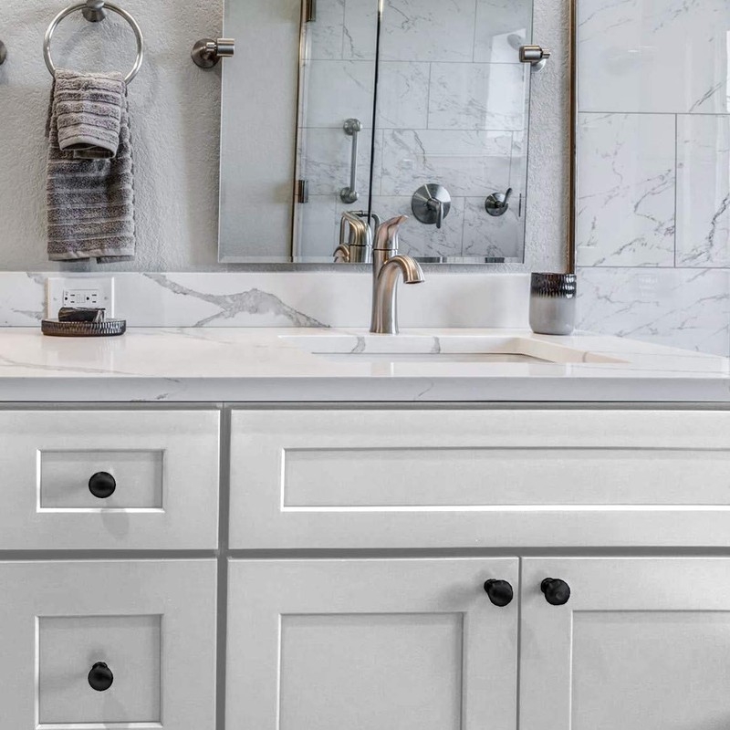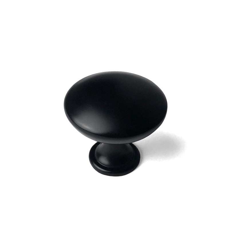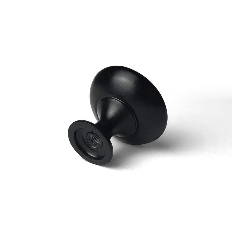 - Beautifully crafted zinc metal design with a matte black finish. Smooth-shaped knob looks great on kitchen cabinets, vanities, wardrobes, dressers, bins and more.
