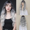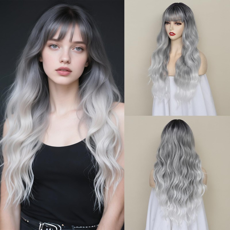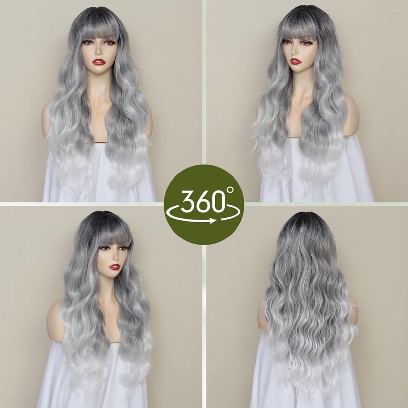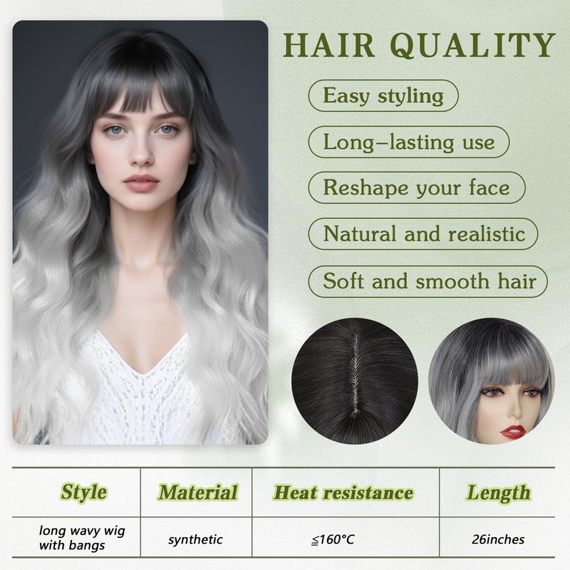 Angzon Long Grey Wavy Wig With Bangs for Women 26 Inch Ombre Gray Curly Wavy Wig With Bangs Natural Looking Synthetic Heat Resistant Fiber Wig for Daily Party Use