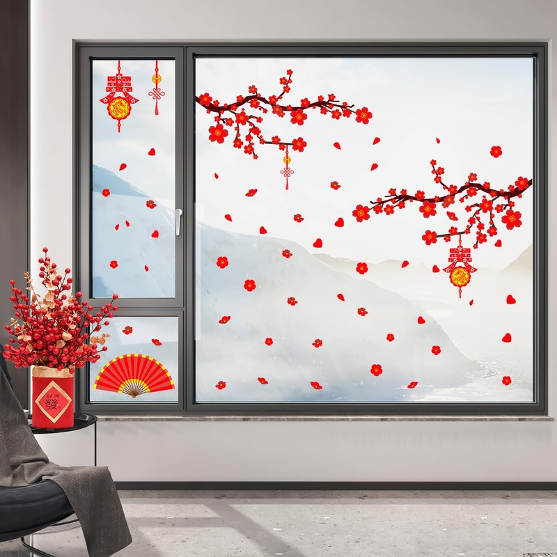 ANHUIB Spring Festival Window Decals,Chinese New Year Window Stickers,Happy New Year Window Clings,2025 New Year Window Stickers Decoration,Removable Red Flowers Wall Decals for Bedroom Living Room