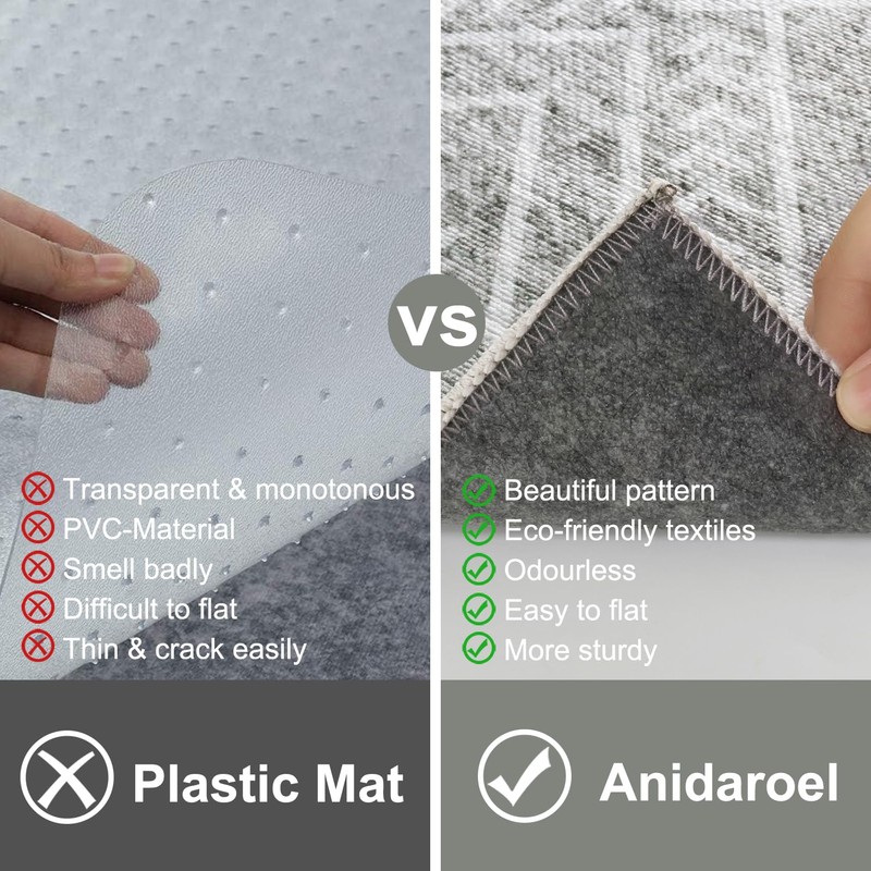 - [Stylish Functional Aesthetic rug] - Unlike conventional clear plastic mats or solid color floor mats, Anidaroel under desk rugs are crafted from high-quality printed fabric surface adds a touch of softness to your floor. and Vibrant colors and stylish designs have been infused to easily match your hard floors. Perfect for offices, computer rooms, gaming rooms, bedrooms, and study spaces.