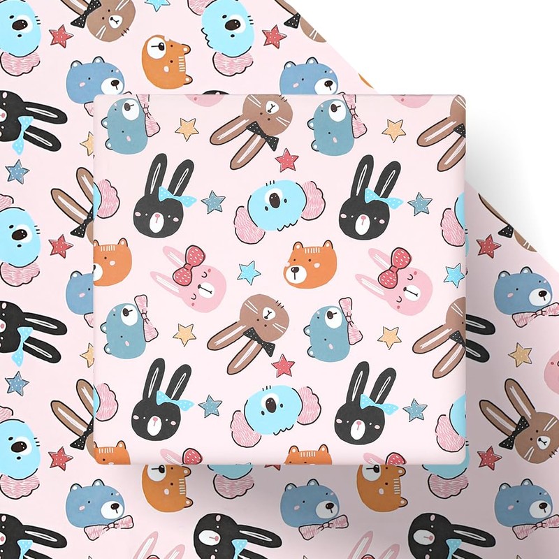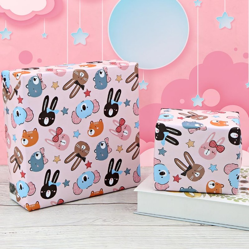 - 【LOVELY GIFT WRPPING PAPER】This pink wrapping background wrapping paper design with many cute pattern like pink and brown bunny,blue koalas,orange and gray bears,kids will very love it.