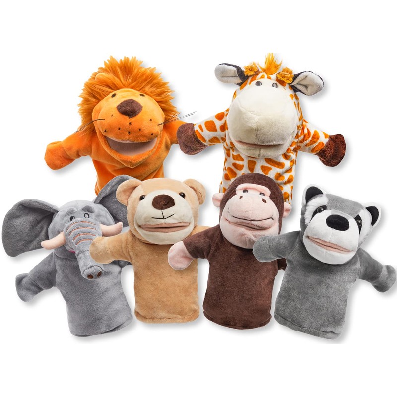 • 6 Animal hand puppets for kids– elephant, giraffe, lion, bear, raccoon and monkey.