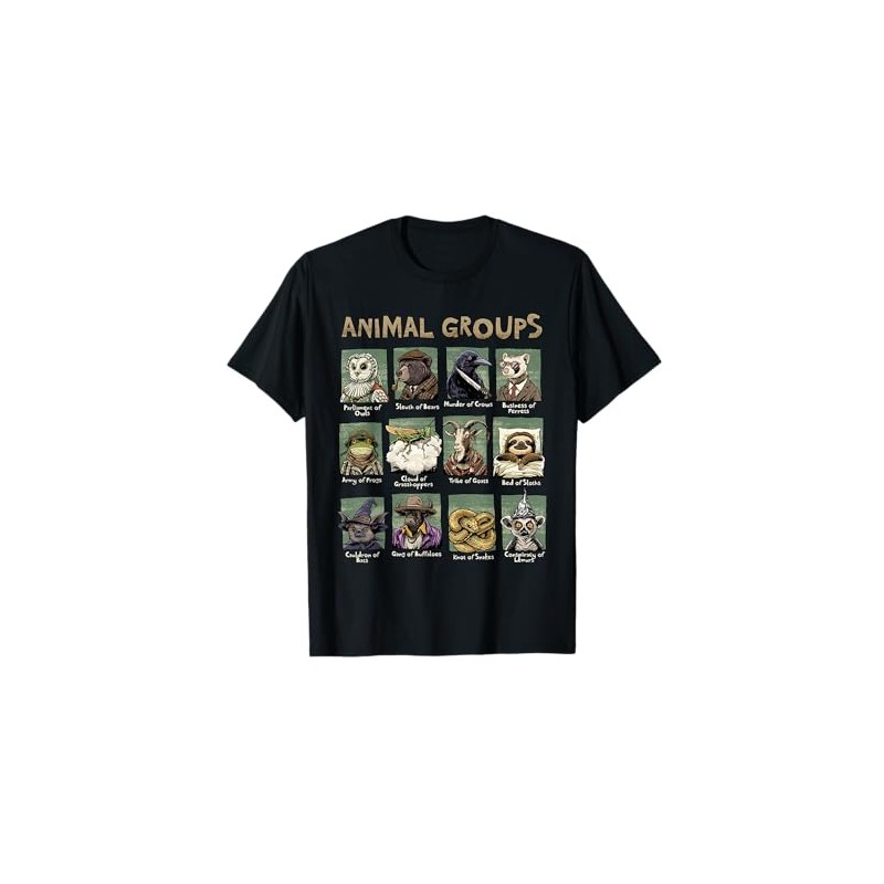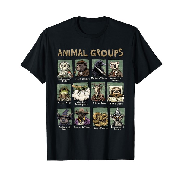 - Explore the animal kingdom with our "Animal Groups Unveiled" design, featuring 12 unique animals and their fascinating group names, from a parliament of owls to a conspiracy of lemurs.