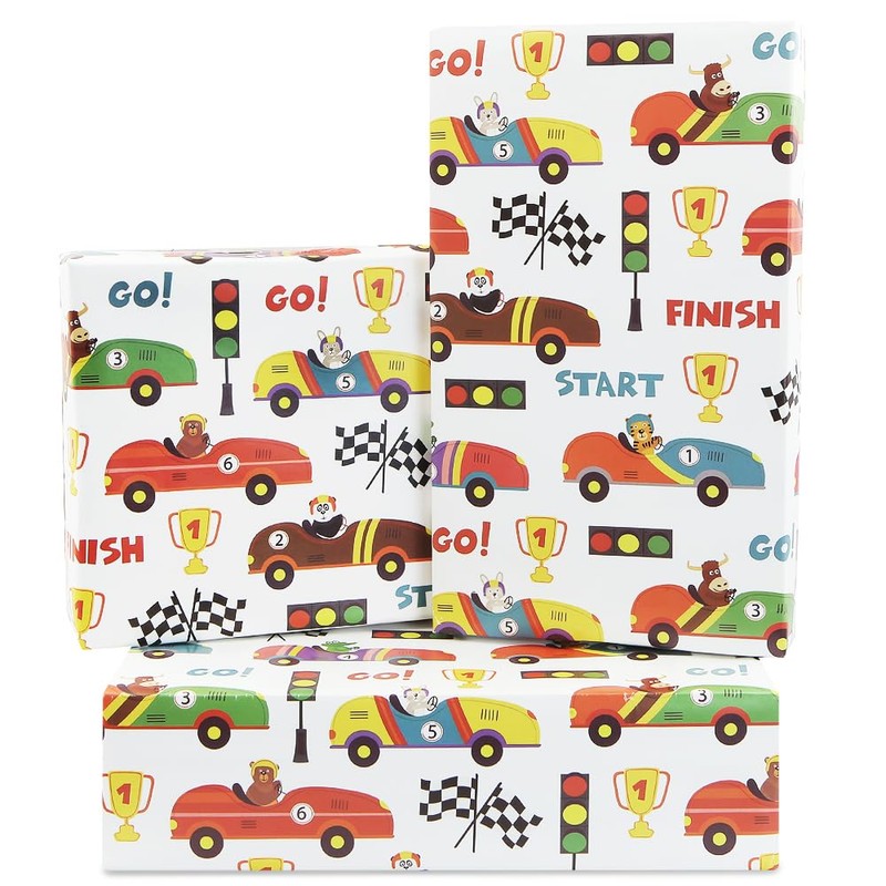 - 🏎️【Animals Race Car Design】: This animal wrapping paper set comes with rabbit, tiger, bull, crocodile and panda racing designs.Cute and Cartoon, classic, simple but fun creative printed on white art paper, which definitely brings you a strong visual impact and impresses each child.