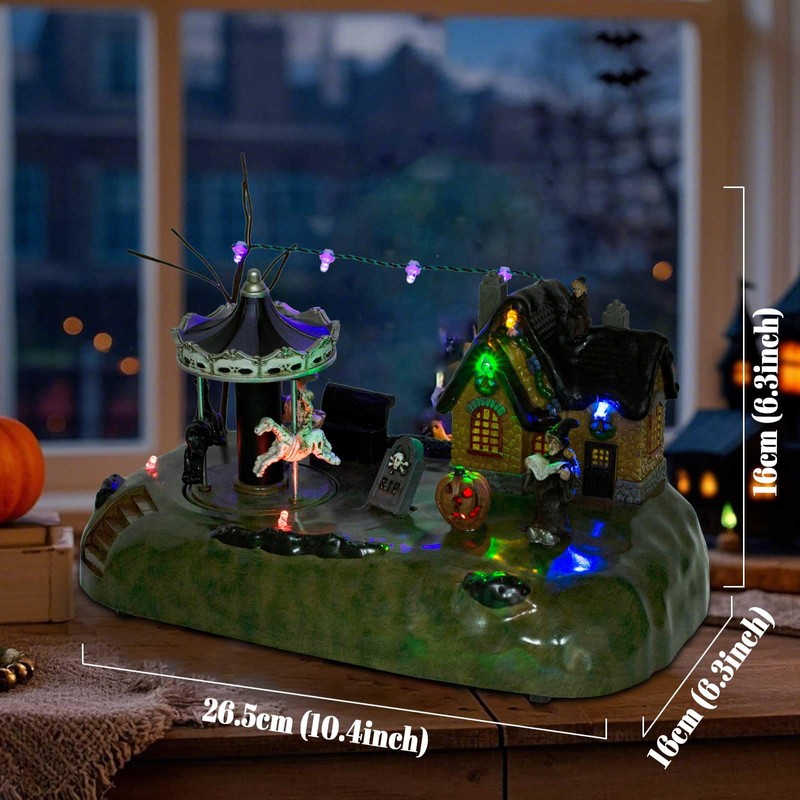 Animated Halloween Carousel Village House, LED Spooky Festival Display Collection Battery Operate, Indoor Use only