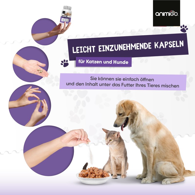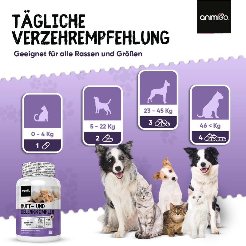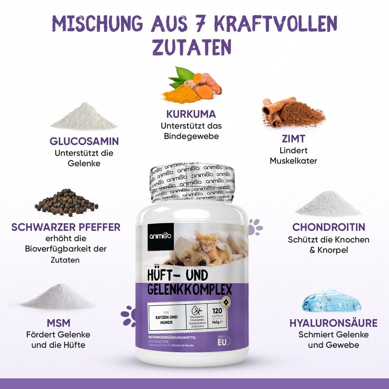 Animigo Hüft & Gelenk Komplex für Hunde & Katzen mit MSM, Glucosamin, Kurkuma Chondroitin, Hyaluronsäure & Zimt für Knochen, Gelenke & Beweglichkeit - 120 Kapseln - Gelenk- & Knochenschutz für hunde Haustiere brauchen Bewegung, nicht selten kann es aber zu Verschleiß in den Gelenken oder in der Hüfte kommen. Unsere Kapseln für Hunde und Katzen können die Knochen und Gelenken unterstützen, für mehr Beweglichkeit. Die Gelenk Kapseln enthalten natürlichen Zutaten, um Ihren Liebling in jedem Alter aktiv zu halten. Unsere Gelenkkapseln für Hunde und Katzen sind weich und einfacher einzunehmen als andere Gelenktabletten für Hunde und Katzen. Unsere Nahrungsergänzung enthält 350mg Kurkuma Pulver, 250mg Zimtpulver, 52mg Schwarzer Pfeffer Pulver, 25mg MSM, 250mg Glucosamin Sulfat, 50mg Chondroitin Sulfat und Hyaluron, um die Gelenke Ihres Haustiers von innen zu unterstützen. Animigo Hüft & Gelenk Komplex Kapseln können die Körperfunktionen unterstützen und zum allgemeinen Wohlbefinden Ihrer Haustiere beitragen. Durch die Zugabe von Kurkuma und schwarzem Pfeffer können die Nährstoffe besser aufgenommen werden. Die Katzen und Hunde Kapseln sollen die Knochen stärken, die Knorpel vor dem Abbau schützen und die Regeneration der Muskeln fördern. Alle unsere Produkte sind mit natürlichen Zutaten hergestellt, die vorab getestet werden. Unser Hüft & Gelenk Komplex für Haustiere ist für alle Größen und Rassen von Katzen und Hunden geeignet.