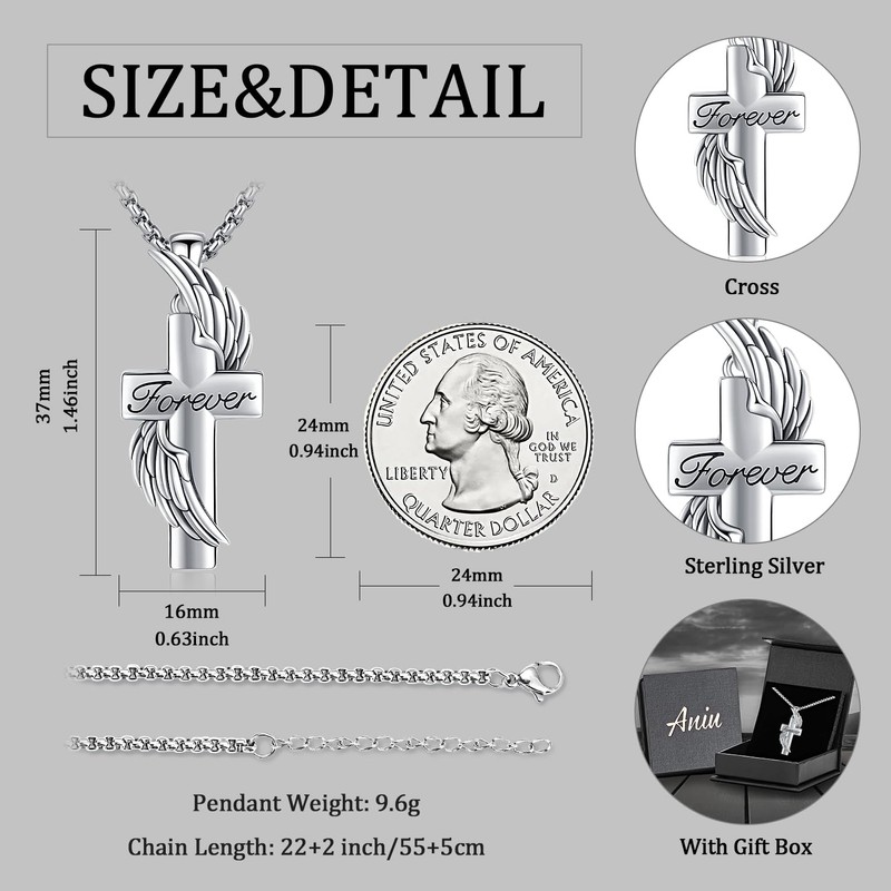 - Size: Sterling silver urn pendant: 16*37mm (0.63*1.46inch), cross angel wing urn pendant weight: 9.6g, Adjustable chain length: 22+2inches. This fine necklace is a great memorial gift for men,dad,grandpa,son,grandson,brother,husband,best friend.