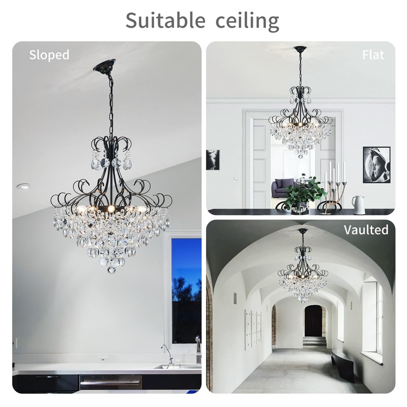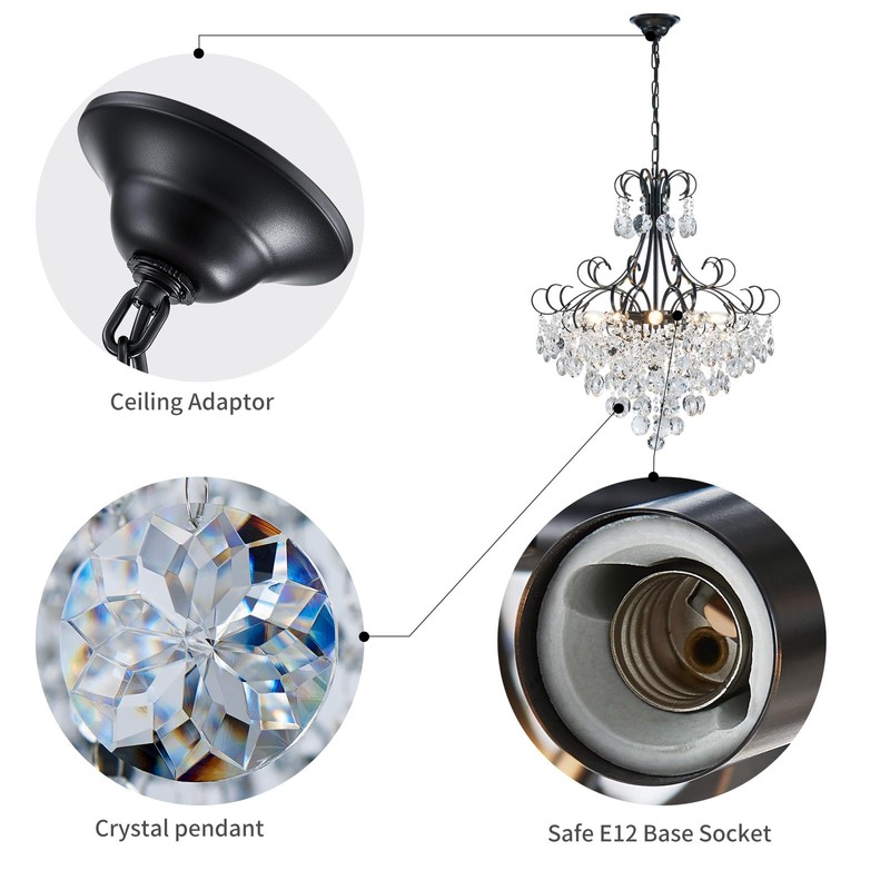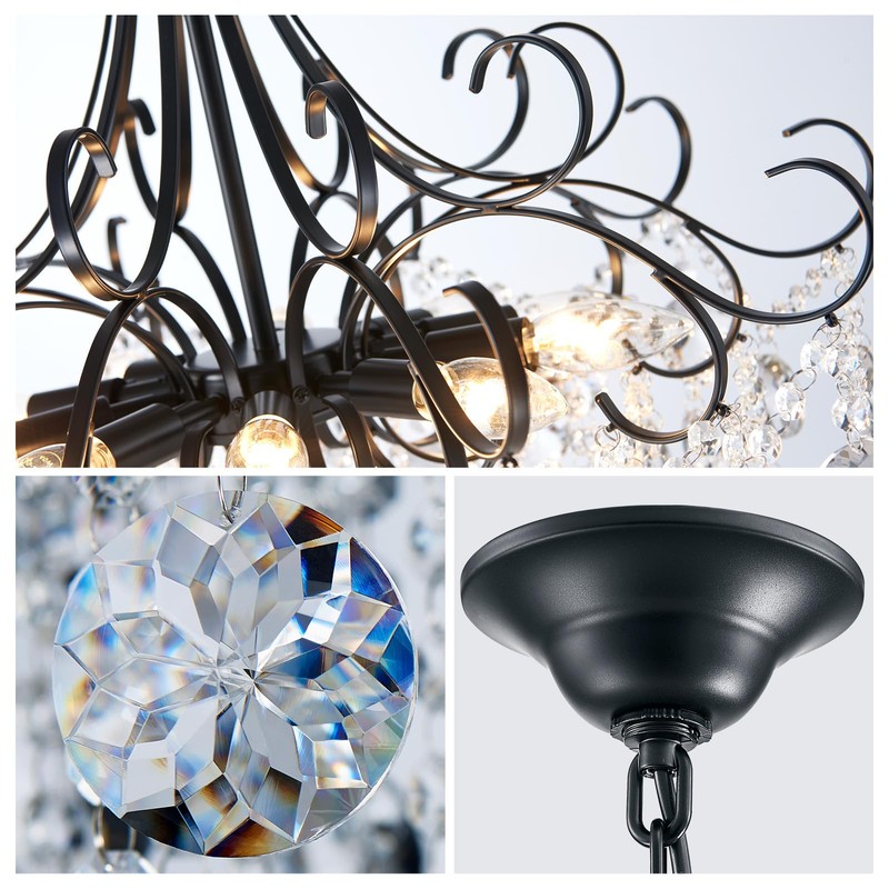 - 💡Unique Crystal Glass Design: Never fall off, never fade. This unique style of black crystal chandelier with crystal lamp as a feature, crystal clear home decoration.