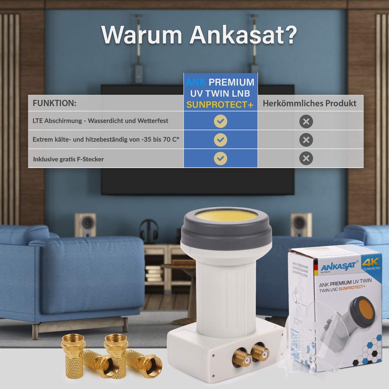 - The ANKASAT ANK Premium UV Twin LNB has been specially designed for extreme weather conditions and offers very good reception properties in heat and cold (-35° ~ +70°C). The included weather protection cap provides additional protection against heavy rain, snow and hail + 4 gold-plated F-connectors