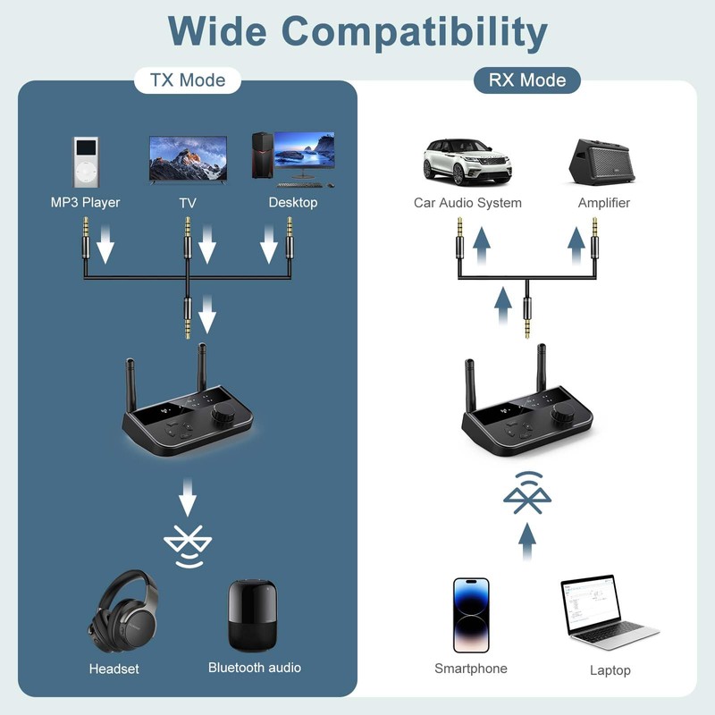 - 🔥2-in-1 BLUETOOTH ADAPTER: Bluetooth transmitter and receiver 2-in-1 design, the adapter can turn your old car stereo and desktop computer into Bluetooth-enabled devices, and home wired speakers or headphones into wireless devices. Pair this auxiliary Bluetooth receiver with your smartphone, tablet, laptop or Bluetooth stereo and Bluetooth headphones to enjoy your favourite streaming music.