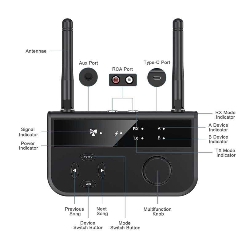 - ⚡DOUBLE DEVICE CONNECTION: This Bluetooth transmitter is different from ordinary transmitters in the market, it can connect two devices at the same time, TX mode can connect two headphones at the same time, RX mode can pair two devices at the same time(Procedure: After connecting the first device, if you need to connect the second device, short press the A/B button to start searching)