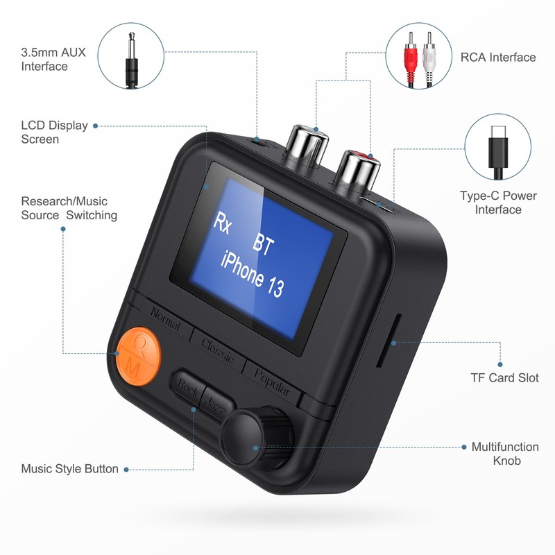 - 【2 in 1 Bluetooth Transmitter Receiver】This Bluetooth adapter integrates two functions of Bluetooth transmitter and Bluetooth receiver in one, you can play music through Bluetooth connection, you can freely choose music EQ according to your preference, you can choose 5 music styles of normal/rock/pop/classic/jazz. It can also parse the audio from SD card for playback.