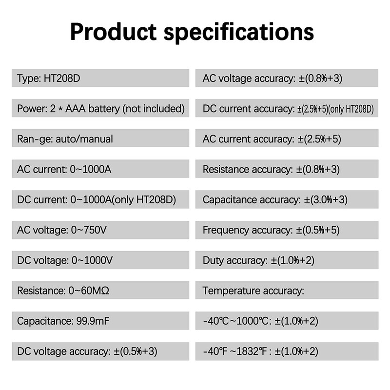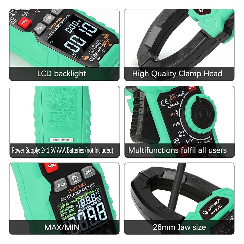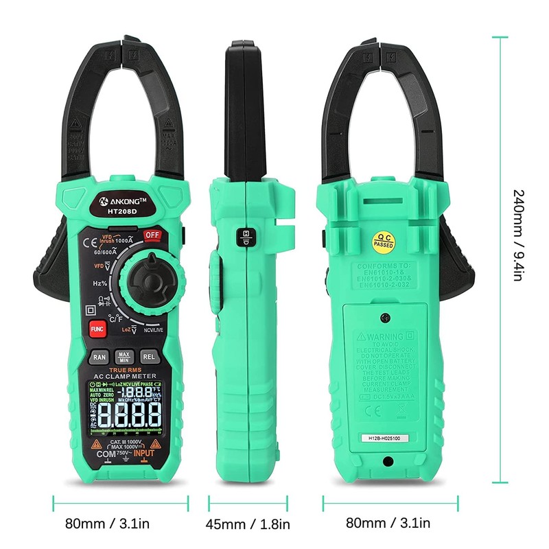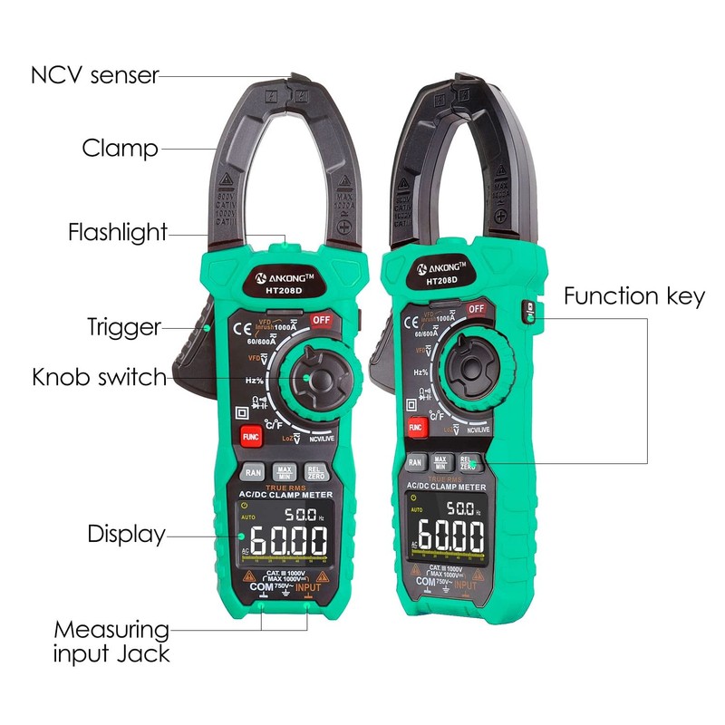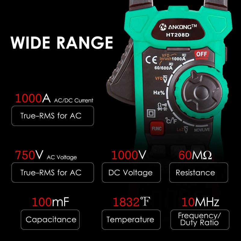 ANKONG HT208D AC/DC Digital Clamp Meter Multimeter 6000 Counts Voltage Tester Auto-ranging, Measures Current Voltage Temperature Capacitance Resistance Diodes Continuity Duty-Cycle