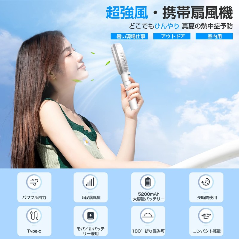 Anktec Portable Fan, Handy, Silent, USB Rechargeable, Small Size, Dual Power Bank, 5 Levels of Airflow, Powerful, Large Airflow, USB, Mini, Strong Wind, Handheld, Tabletop, Heatstroke Prevention, Foldable, Compact, Strap (White)
