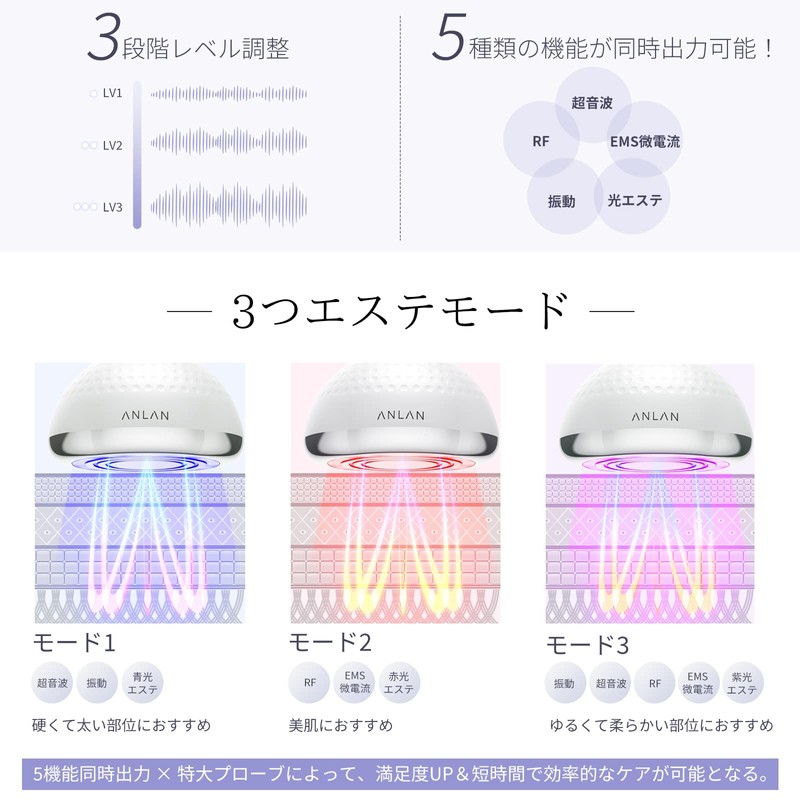 - (Concentrated Care for Your Body) EASILY SHAPING in 10 minutes every day. ANLAN Cavitation Facial Beautifying Device is an EMS, RF, hot heat, vibration, ultrasonic waves, and 3 color LED effects. When you touch the ultrasonic high-speed vibrations on your body, it transmits high speed vibrations to your skin, giving you a powerful approach to areas of concern, and enhancing your body line and charm