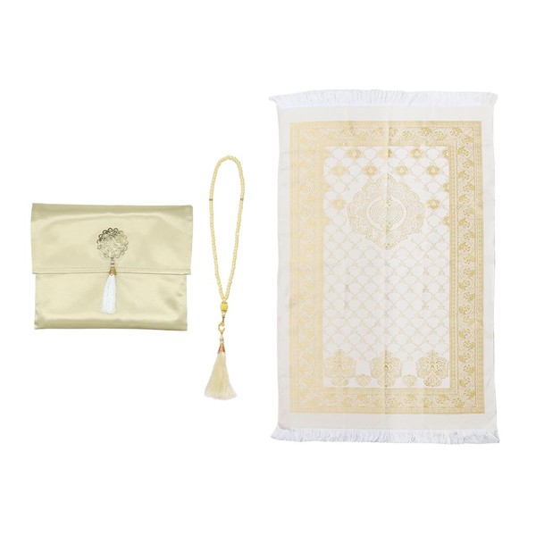 Anlising Muslim Prayer Mat with Prayer Beads and Fabric Bag, Foldable, Yellow, 110x70CM