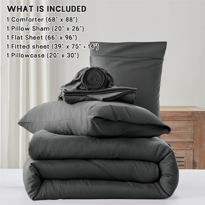 Anluoer Dark Grey Twin Comforter Set 5 Pieces, Bed in a Bag with Sheets, All Season Bedding Sets with 1 Comforter, 1 Pillow Sham, 1 Pillowcase, 1 Flat Sheet, 1 Fitted Sheet