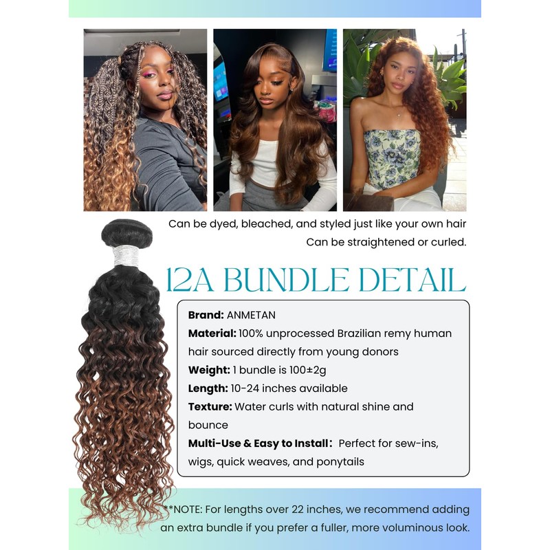- 🍯【Premium Salon Quality】We use 100% unprocessed Brazilian remy human hair (excluding strands under 8"), sourced directly from young donors. This premium hair is clean, healthy, and exceptionally durable for long-lasting wear. Our T1B/2/30 water wave ombre bundles can be safely bleached, dyed, and heat-styled without premature damage or shedding, maintain easily.