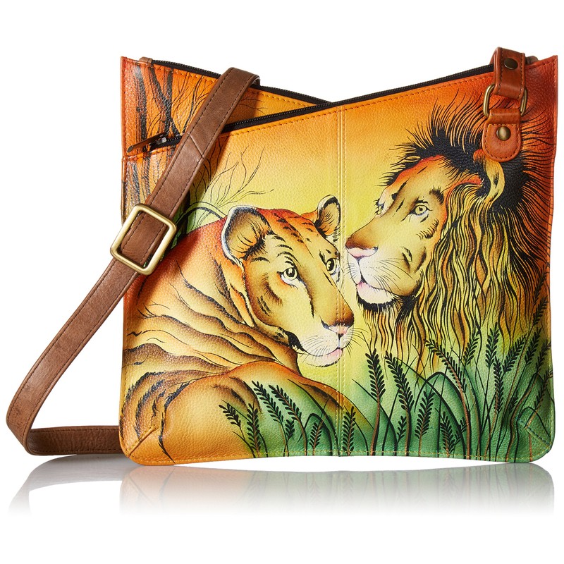 Anna by Anuschka Hand Painted Leather Women's V TOP MULTICOMPARTMENT Crossbody, Lion in Love