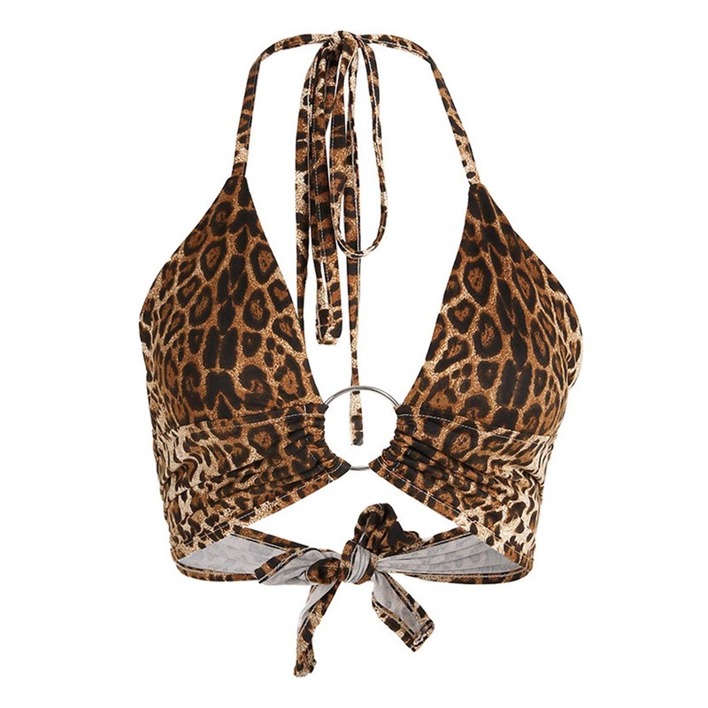 Anna-Kaci Women USA Flag Halter Backless Camis Streetwear Club Patchwork Camisole Crop Top, Leopard, Medium
