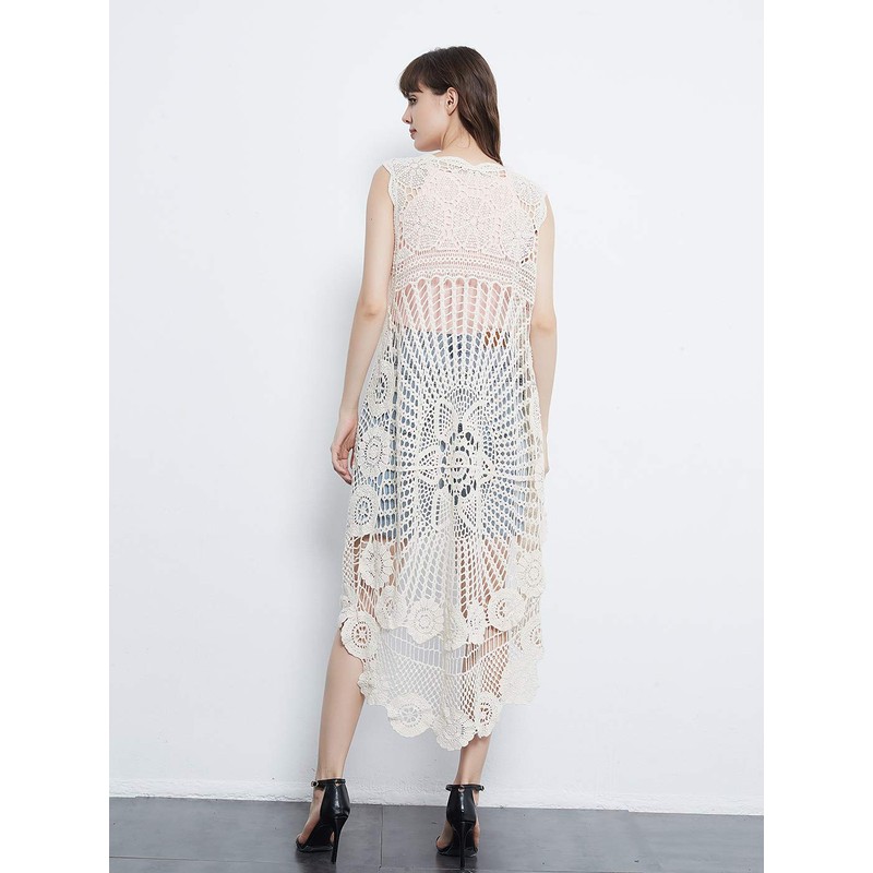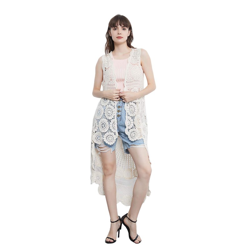 - UNIQUE DESIGN -- Lightweight open front sleeveless cover up cardigan featuring cut out flower lace design.This bohemian, floral detailed style cardigan featuring an asymmetric hem design, large arm cutouts and loose oversized fit is flattering for all body types.