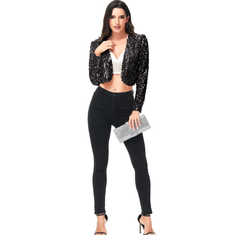 - Long sleeve cropped open front bolero jacket covered in all over light catching sparkling sequins.