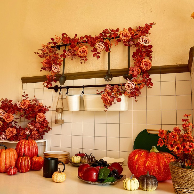 - š¼ćReal and Nature Lookingć - Fall flowers and vivid roses, scattered gypsophila, and dense eucalyptus leaves make the whole rattan look more realistic and beautiful. The rattan is not vertical, but has a natural curvature. Let people easily enjoy the beauty of nature.