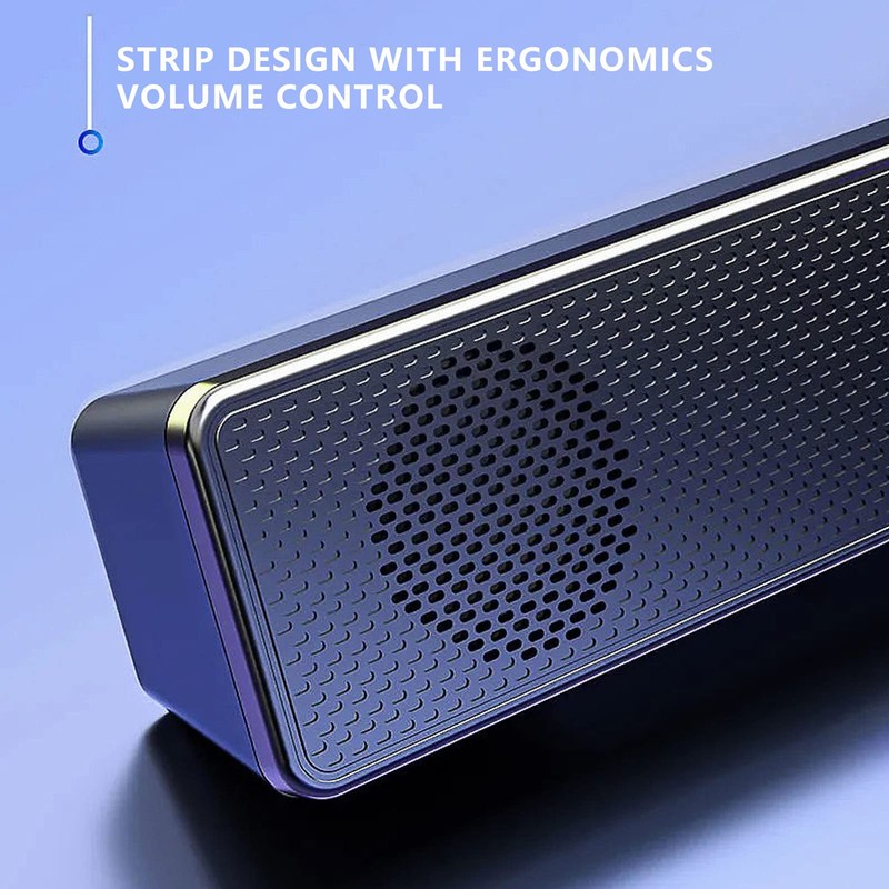 - UNIQUE APPEARANCE DESIGN The stripe design with ergonomics not only saves space, but also can deliver 3D sound to the greater extent. You can adjust the volume button on the top of the computer speaker to the appropriate position as needed.