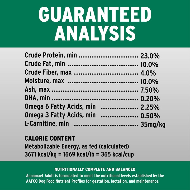 Designed for older dogs or dogs with slower metabolisms, Adult is also a popular formula with kennels. Annamaet Adult is made with low ash chicken and brown rice. Like all Annamaet original formulas, it is corn, wheat, and soy free. Annamaet Adult is formulated to meet all the nutritional levels established by the AAFCO Dog Food Nutrient Profiles for All Life Stages, including growth of large size dogs (70 lbs. or more as an adult).