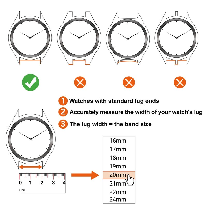 - Select Band Width (Size): Compatible with most traditional or smart watch that uses 16mm, 17mm, 18mm, 19mm, 20mm, 22mm, 24mm spring bars. Quick release spring bars are included with and integrated into the band, so it is important that your watch's lug width matches exactly