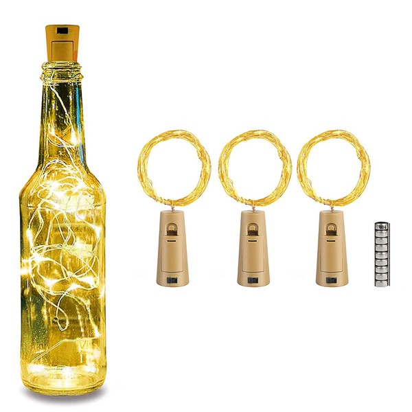 Size: 3pack Bottle light transforms your room with a romantic mood, Made from flexible pliable silver wire that adapts to any shape you want. Drop the chain of bright LED lights in an empty wine or liquor bottle, to create a beautiful and romantic atmosphere for the whole room. For any decorative occasion, suitable for party, wedding, Christmas, New Year, Halloween, square, garden, indoor decoration, outdoor decoration, etc. Specification: Material: copper wire and plastic LED color: warm white Total LED lamps per row: 20 LEDs Powered by: 3 x LR44 or AG13 batteries (Included) Per individual part length: 2m Total LED bulbs per item length: 20 LEDs. Distance between per LED bulb: 10cm Wattage: 0.5 watt Protection class: IP65 for copper wire (the battery compartment is not waterproof) How do I use the wine bottle lights with corks? Step 1: After unpacking the package, take off the insulation sheet and check the light; Step 2: turn on the light using the on / off switch; Step 3: Switch off the light in good time after use and put the insulation back in to extend the life of the batteries. Package includes: 3 * bottle light 2 m with 20 LEDs each (9 batteries included)
