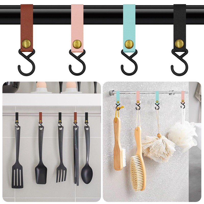 - Easy to use: the combination of S hook and leather ring can be easily opened and closed at the touch of a button. Leather rings can also prevent hooks from falling off when items are removed.