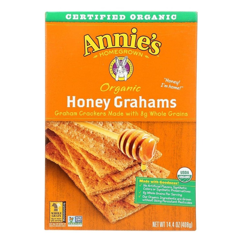 Annie's Homegrown Organic Honey Graham Crackers make it possible to snack without guilt. Made with USDA certified organic ingredients and a touch of honey, our graham crackers are perfect for people who want a wholesome treat. You can feel good about eating our graham crackers because they have 8 grams of whole grains per serving and don't contain any artificial flavors, preservatives, GMOs or synthetic colors. Our packaging is made from recycled materials to help minimize your carbon footprint. Includes one 14.4 oz. box of organic honey graham crackers. Annie's has a commitment to bettering the world through nourishing foods, honest words and conduct that is considerate and kind. From the farms we source our ingredients from all the way to the packaging our food is shipped in, we are conscious not only of your family's health and wellness, but that of the planet.