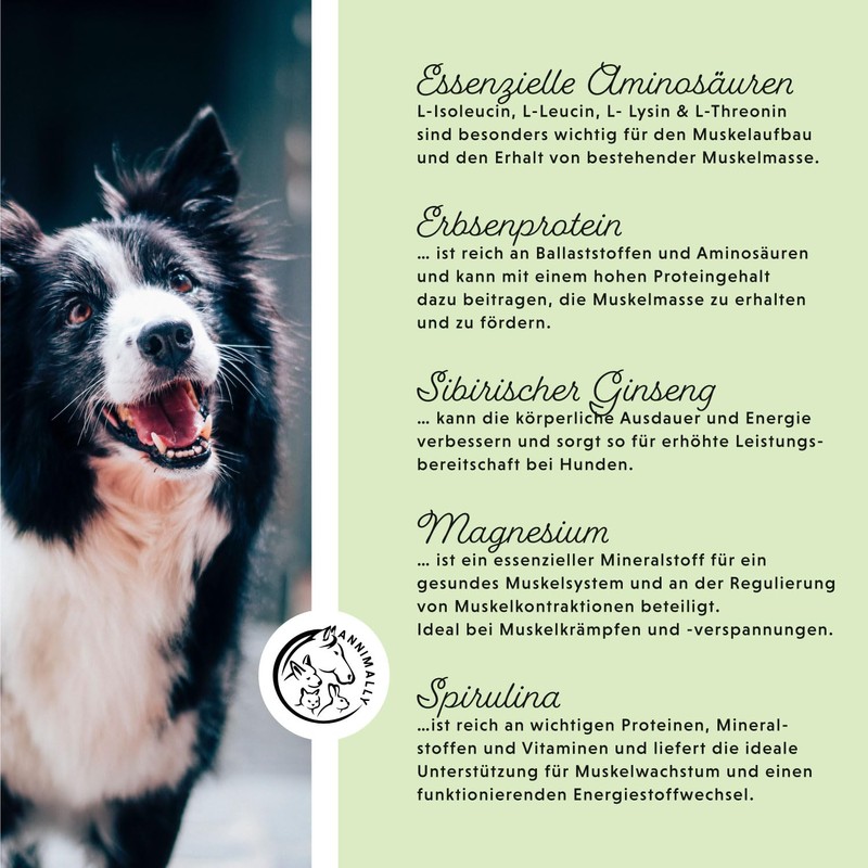 - Supplement to joint tablets – the muscle power tablets are the ideal support for active dogs and promote long-term and healthy muscle building. For older dogs, the ideal addition to our Annimally joint tablets, as joints and muscles can be supportively built.